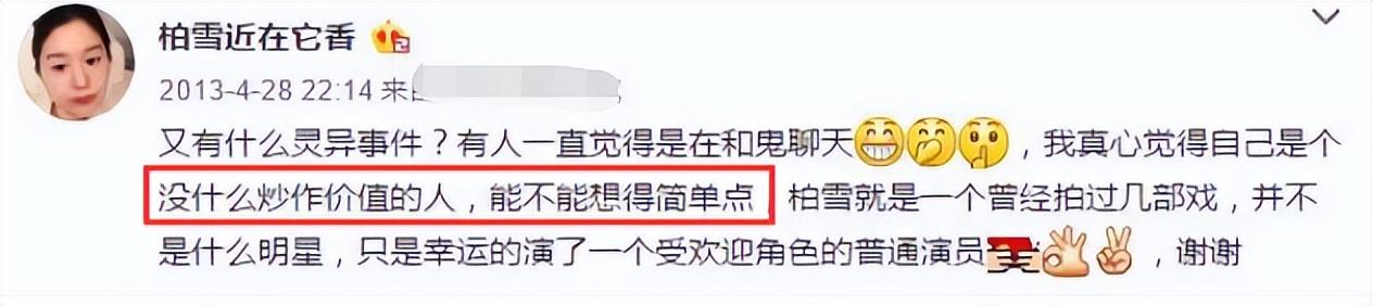 柏雪灵异事件沸沸扬扬地传了10年,比较靠谱的说法是她与经纪公司合作得不愉快,后来接不到戏,又恰好结识富商,便结婚生子了。