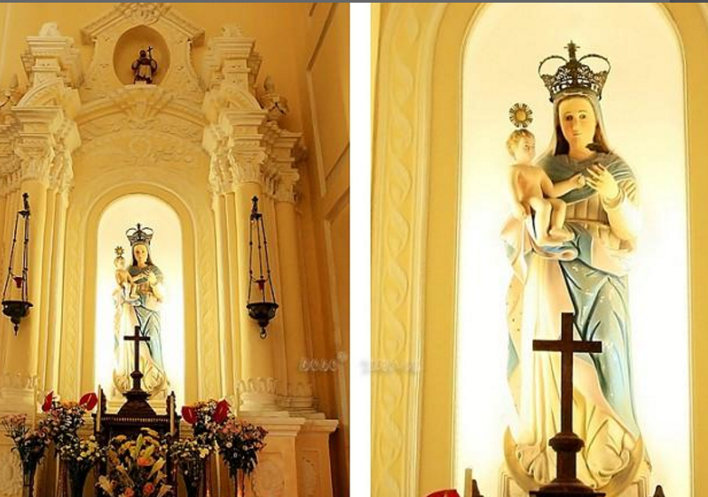 澳门圣母玫瑰教堂是在天主教圣多明我会于16世纪90年代所建的祈祷室和修道院的基础上修建而成。教堂外部由淡黄色石头及白色的灰墁所修建,并安装有绿色百叶窗。内部白色的柱子支撑着天花板,堂内墙壁四周设有围台。巴洛克风格的祭台上矗立着乳白色的童贞圣母和圣子像。