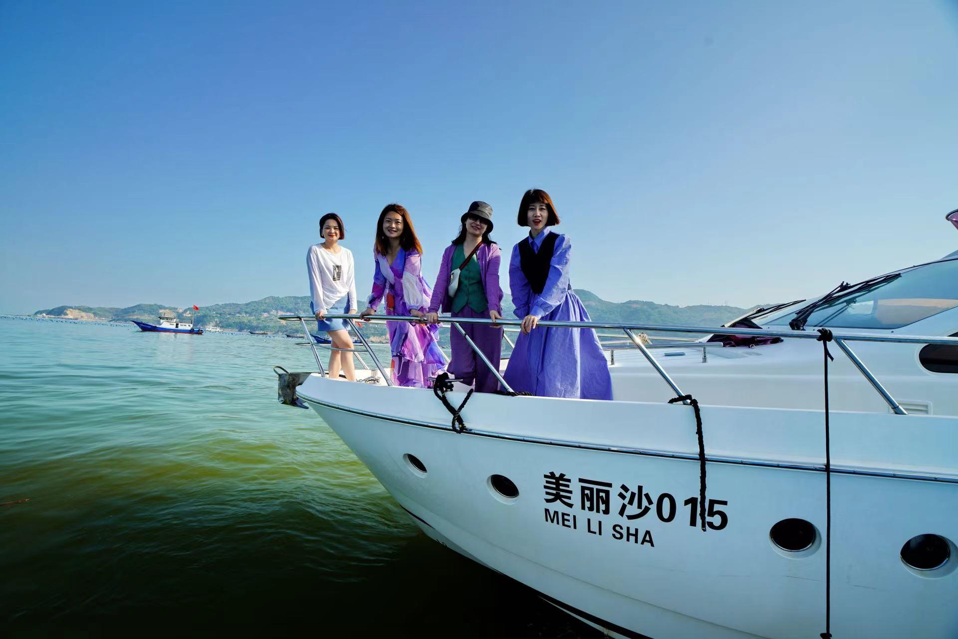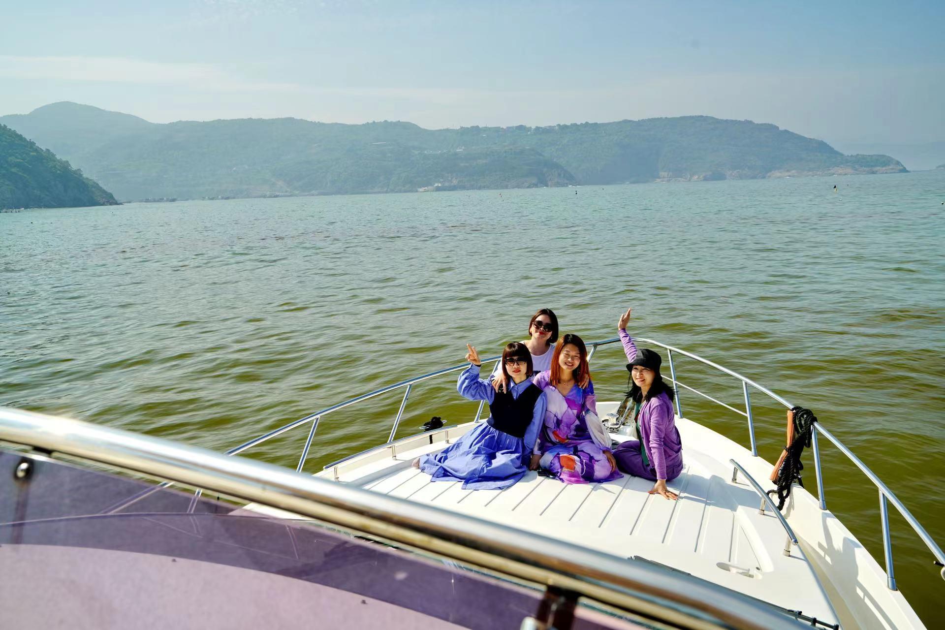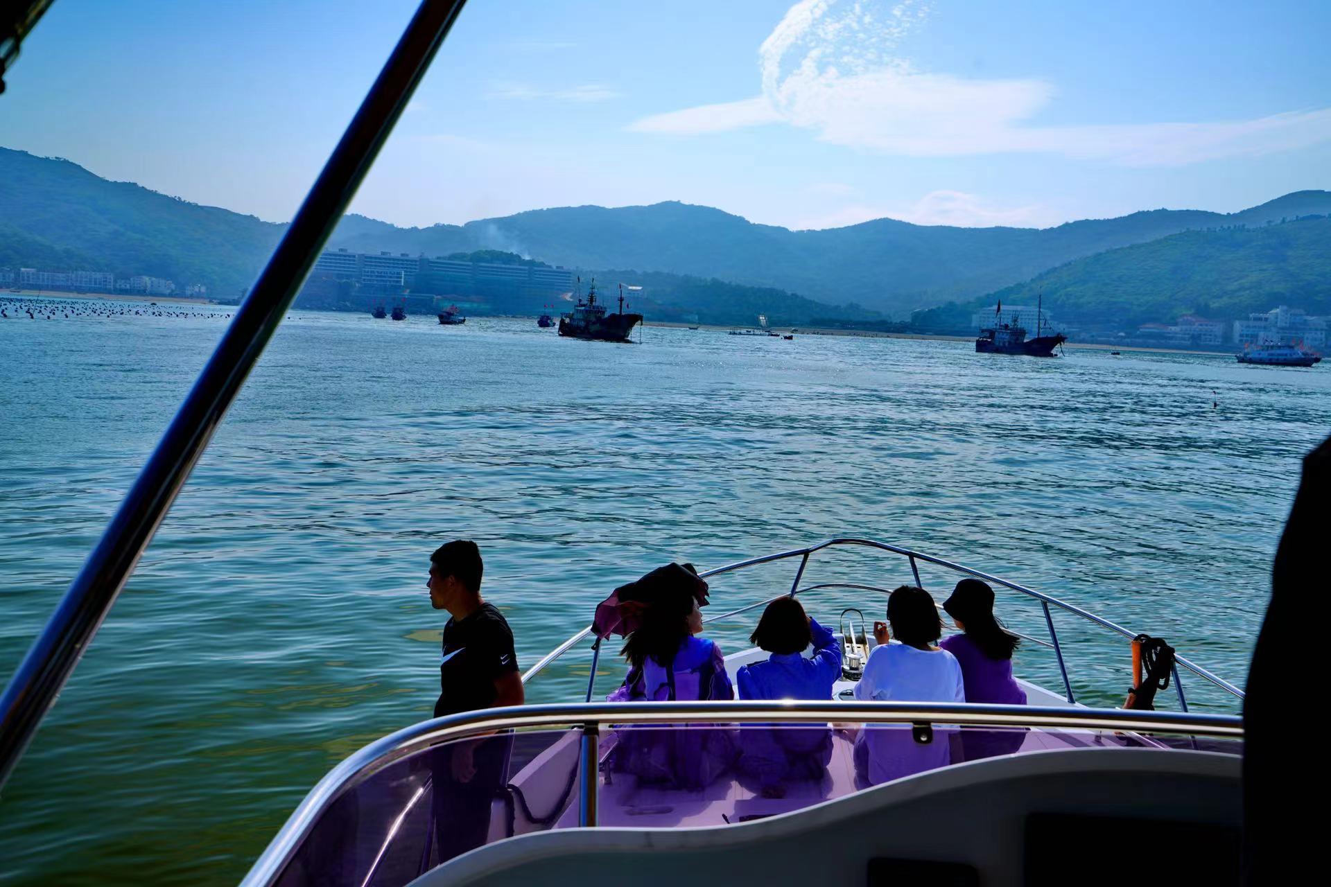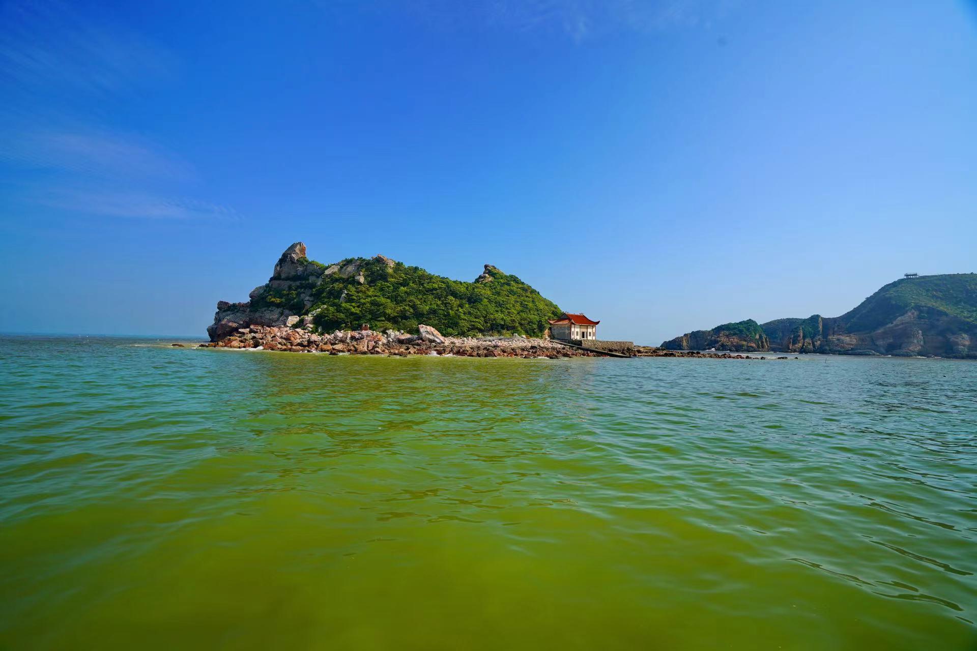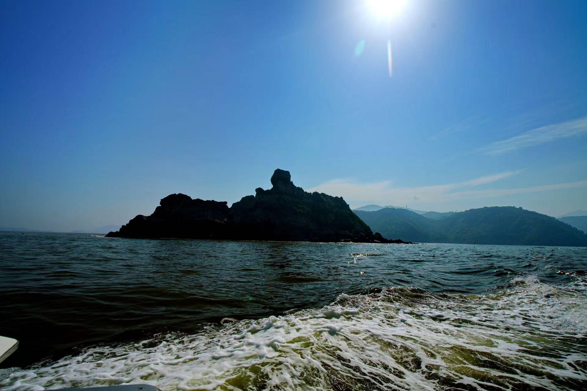 午后,我们坐着游艇,想到金元宝岛走走的,据说那里有一块红色的礁石,很美。而我们靠近金元宝岛时,被告知没有小船接应,带着些许遗憾,我们折回去。